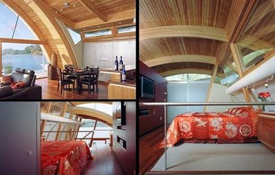A really creative and unique home design, wooden curve style home design, the imaginative use of curved glue lam beams evoke the poetry of the ripples and contours of a river. The expansive glass facade embraces the river and frames the sunset, and one accesses the deck via an expansive sliding glass door.